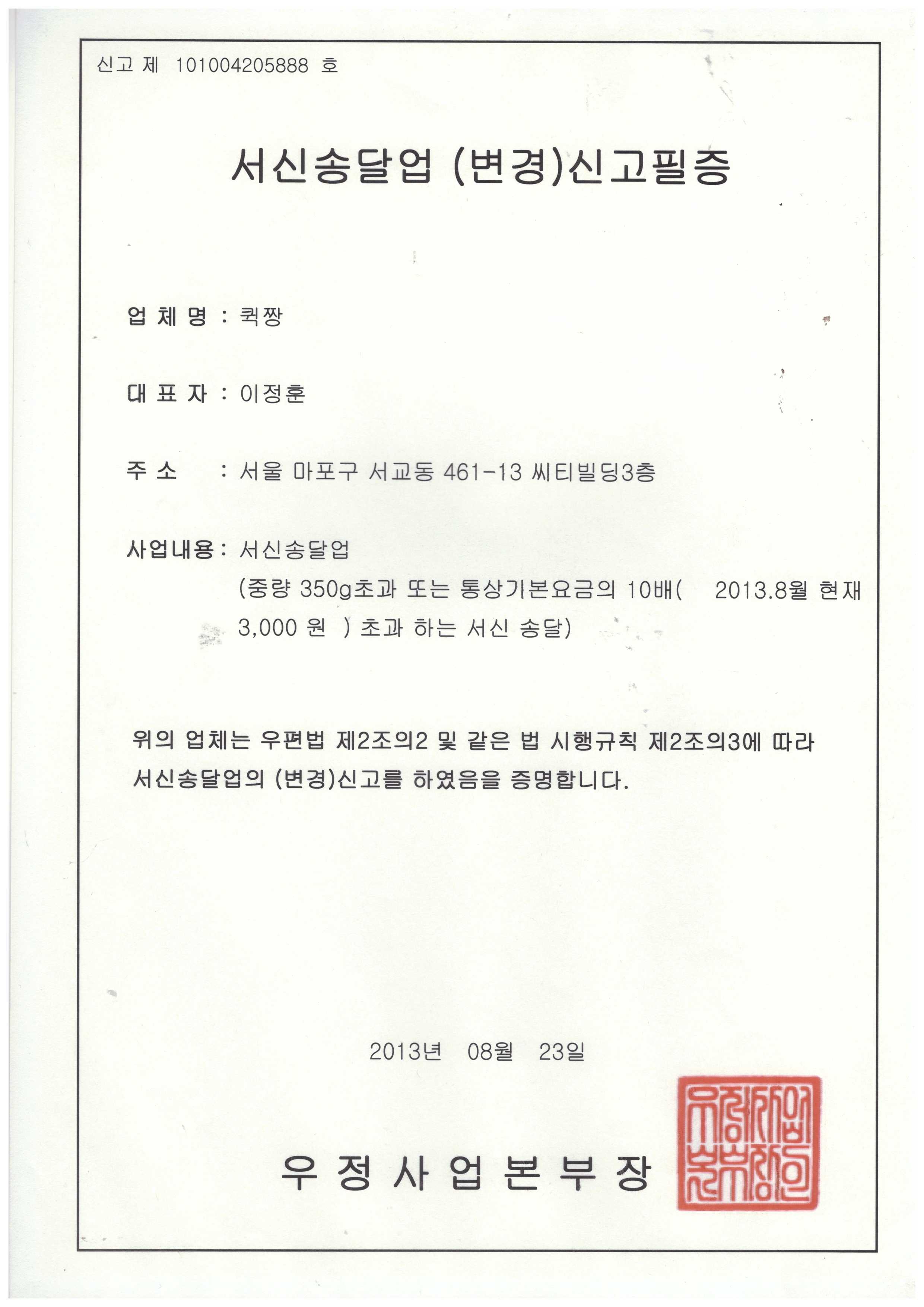 서신송달업 신고필증